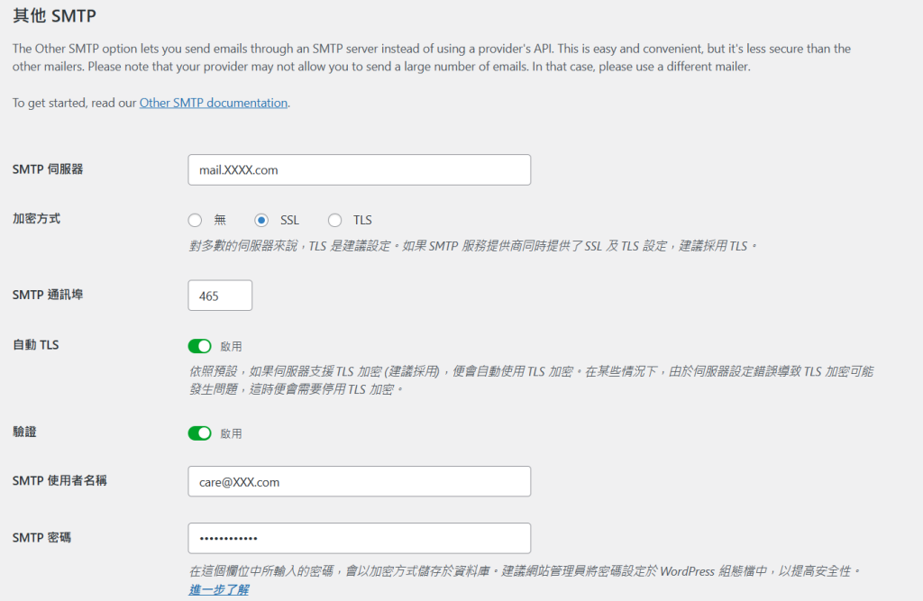 - SMTP 通訊埠:填入 SMTP 連接埠號碼(通常隨著加密方式的選擇會自動顯示)。