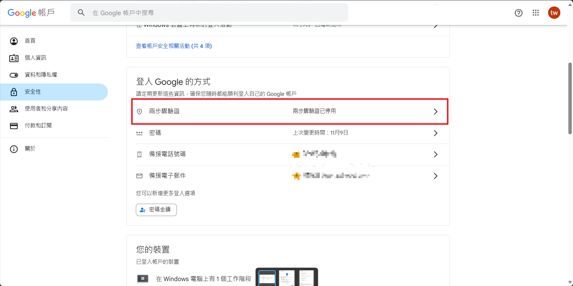 - 點選兩步驟驗證(如果已啟用可略過此步驟)